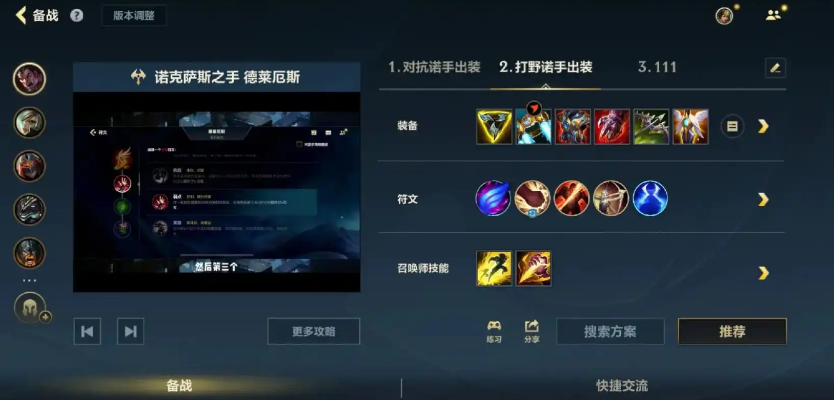 三相之力配合W技能可打出爆发性伤害,血手与死亡之舞增强生存能力确保持续输出,振奋铠甲能强化Q技能回血效果。天赋首选征服者搭配残暴与骸骨镀层,征服者叠满后的攻击力加成与回血效果完美契合诺手持续作战特性。移速流玩法可考虑三速鞋配合风龙buff提升追击能力,但需注意补足双抗避免被秒杀。
