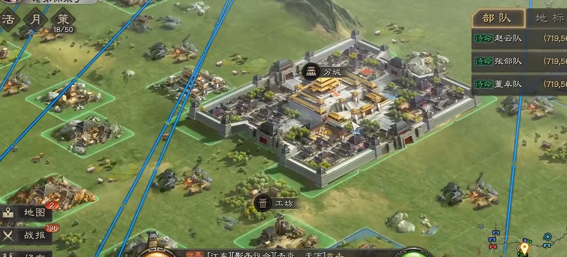主城的安全与防御需要优先考虑城防设施的升级,包括城墙和城防军的强化建设。当主城周边存在未占领的黑色地块时,需及时清理以避免敌方侠客军直接攻城。分城作为主城的战略延伸,其选址需满足11块连地且中心地块达到6级以上的条件,分城建成后可额外配置部队并提升资源存储上限,但需注意分城部队统御值受限于分城君王殿等级,初期无法直接调用主城主力部队。
