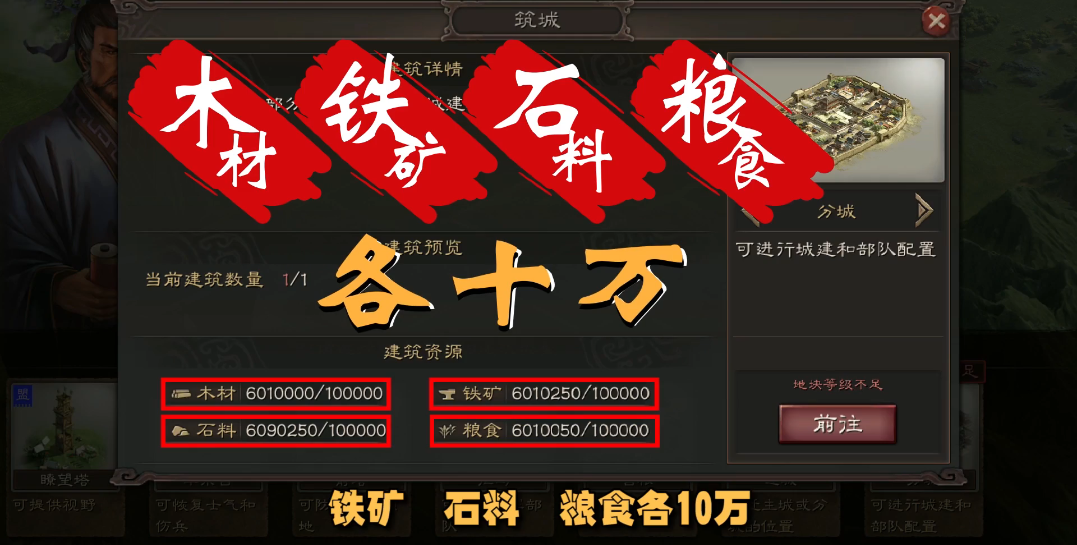 S2赛季建分城首先得满足几个硬性条件,咱们需要名声值达到6000点才能解锁分城功能,这可是最基本的要求。然后得找一块中心是6级以上的地,周围还得有10块相邻的地组成H型布局,总共需要11块连在一起的地。资源方面要准备好木材、铁矿、石料和粮食各10万,这可是个大数目,得提前攒够才行。