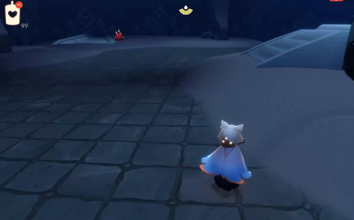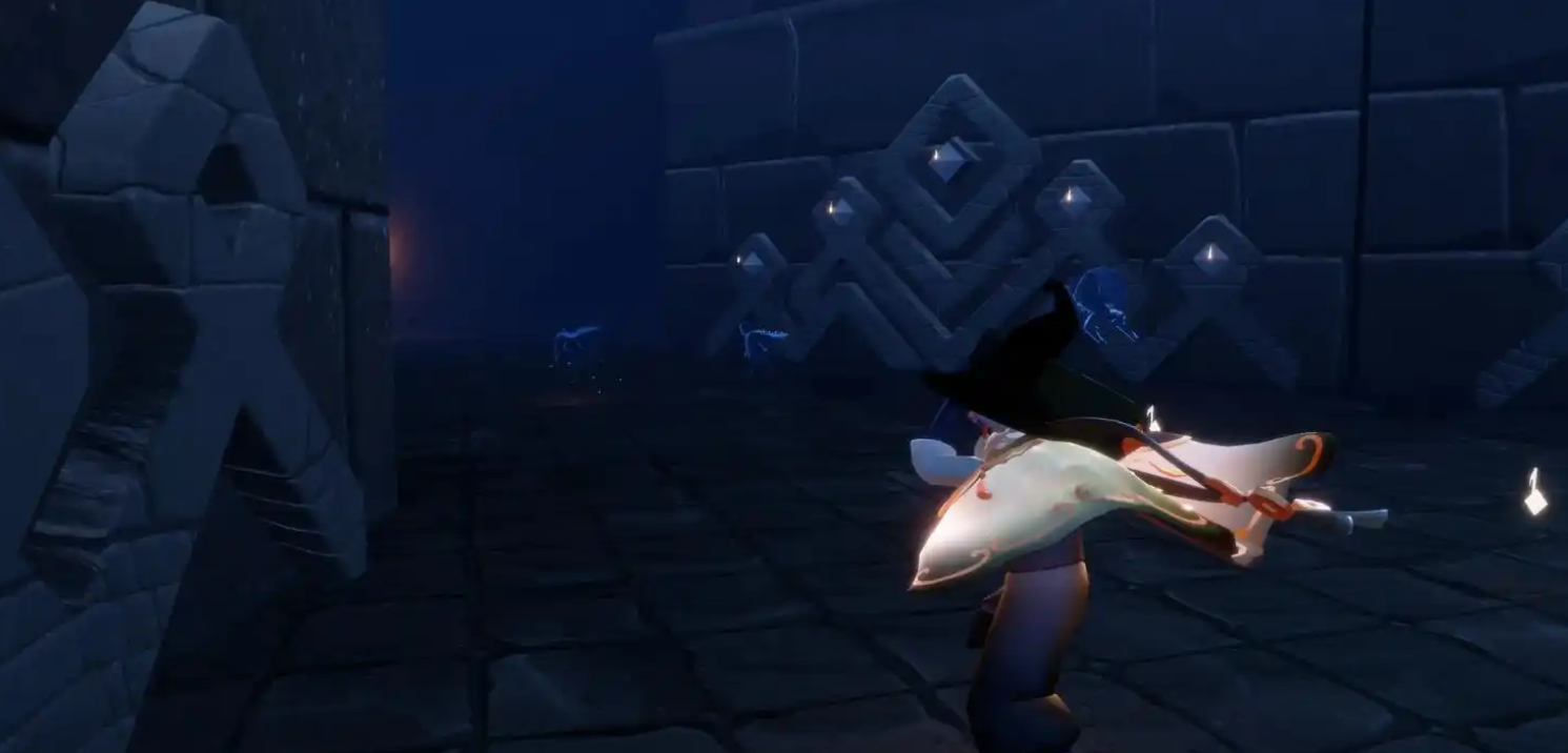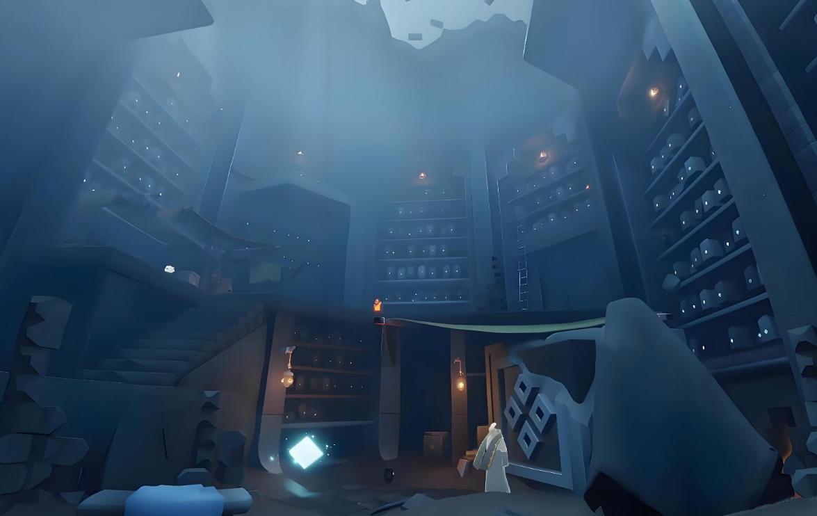 若存在高度差,可通过反复跳跃或使用矮人面具缩小体型尝试卡入;若无缝隙,则需借助椅子道具辅助。将椅子贴近门左侧第一根柱子放置,通过调整坐姿坐标实现穿模进入。成功进入后沿狭长甬道前进至尽头即可找到发光先祖,点燃并跟随完成回忆即可解锁一级祈祷动作。