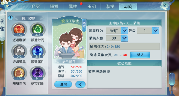 天工志向的核心属性为运气、博学和聪慧。这类萌宝可自动采集天工材料并参与制造,精通后能提供免体力制造次数和额外体力购买机会。运气属性直接影响材料采集品质,博学关系制造成功率,聪慧则缩短制造冷却时间。加点时应保持三项属性均衡发展,其中运气建议分配35%点数,博学和聪慧各30%,剩余5%可点体力增强生存能力。