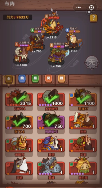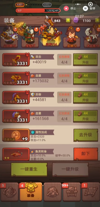 装备方面主升吕布的武器和战马,其他挂件不用投入太多资源。吕布的等级最好达到2400装备尽量拉满,这样才有足够的伤害。挂件们升到900级不进阶就够用,省下的资源全给吕布。记得开火把挂机,火把道具每天白嫖的完全够用,不用心疼。金币袋子先别急着开,等推到更高关卡再开收益更大。