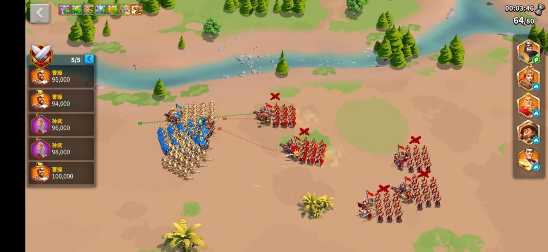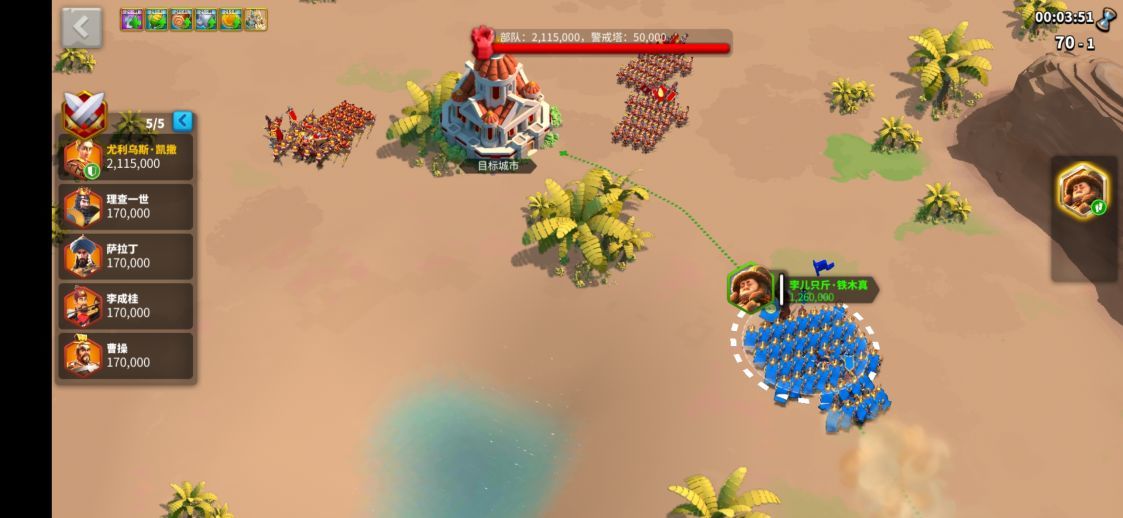 开局将肉盾队放置于第一队列吸引敌方火力,其余四队分散至两侧同步行进,避免进入BOSS警戒区。肉盾队推荐使用理查+查理组合,若强度不足可用孙武或西庇阿替代。输出队伍应绕至BOSS侧翼或后方集中攻击,同时辅助队伍需及时释放减益技能降低敌方攻击力。特殊情况下可利用贝利撒留等高机动统帅临时承担伤害,确保主力部队存活。