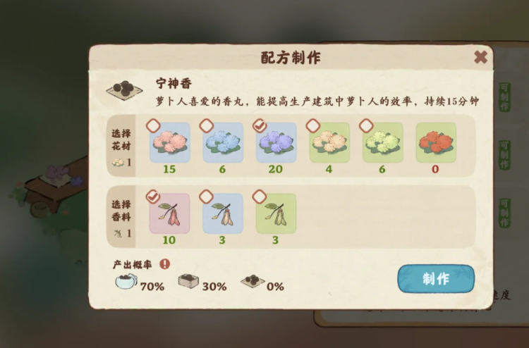 稀有花合成后建议立即使用取苗剪保留种子,避免重复育种消耗资源。取苗剪可在杂货铺用玥琅或山遇商店用青田玉坠购买。香丸制作需搭配对应香料,如绣球配宁神香提升生产效率15分钟,百合配舒心香持续30分钟,花菱草配活气香效果长达60分钟。装饰稀有花会吸引蝴蝶环绕,兼具实用与观赏价值。