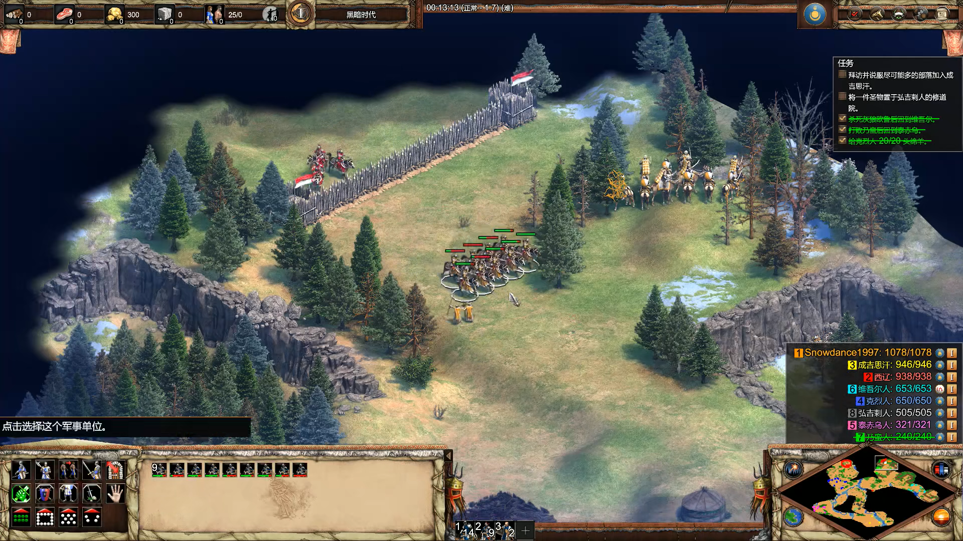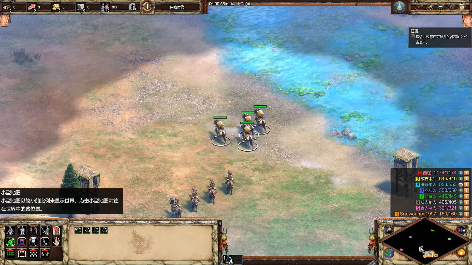开局阶段需要优先解决资源分配问题,初始资源有限,建议将农民分散采集木材和食物。骑射手作为核心兵种应尽早投入生产,同时派遣轻骑兵探索地图寻找额外资源点。蓝色阵营的基地是首要攻击目标,必须在其发展前压制经济。运输船科技无需过早研发,可依靠多次往返完成部队转移。