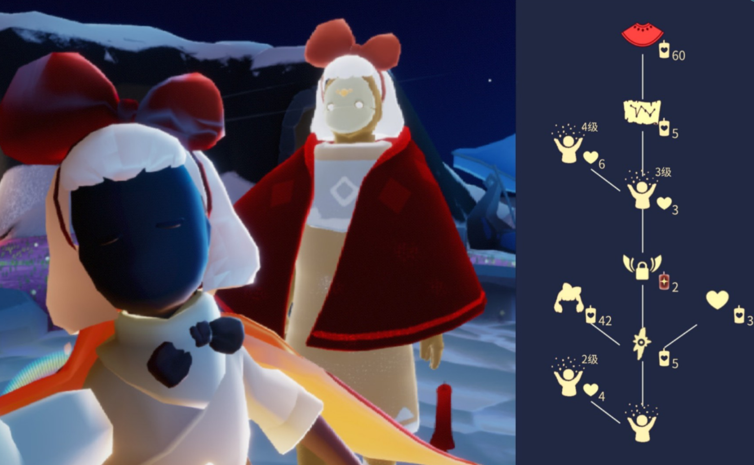 禁阁的灵语者先祖是很多小伙伴喜欢的白斗篷来源。这位先祖藏在禁阁的双人门里,需要和好友一起开门才能见到。白斗篷纯净优雅,搭配各种发型都很合适,不过兑换需要准备50颗爱心,记得多攒点哦。除了白斗篷,这位先祖还带着其他小礼物,路过的时候别忘了打个招呼。