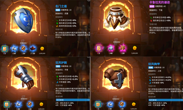 狂风四件套提供移动速度加成,适合骑兵扫田;复兴者套装增强弓兵攻防属性,适合技能型统帅。部分散件如奎因之魂上衣、卡鲁拉克谦逊裤子等虽非套装,但因单件属性突出常被混搭使用。需注意专属天赋可提升装备30%基础属性,因此觉醒统帅搭配专属武器能产生质变。装备方案可在大地图与峡谷对战中同步切换,减少重复调整的时间成本。