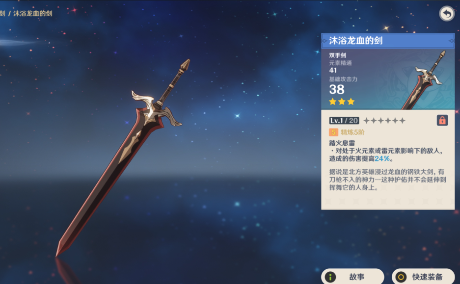 沐浴龙血的剑则更适合需要元素反应的队伍配置。其被动踏火息雷在触发火元素相关反应时能提供全伤害加成,与迪卢克的火元素附魔机制有一定契合度。这把武器的副属性为元素精通,对迪卢克这类以攻击力为主属性的角色收益有限,因此更适合搭配行秋等挂水角色打蒸发反应时使用。若玩家缺乏四星武器,可暂时选用它填补空缺。