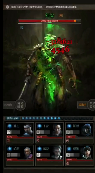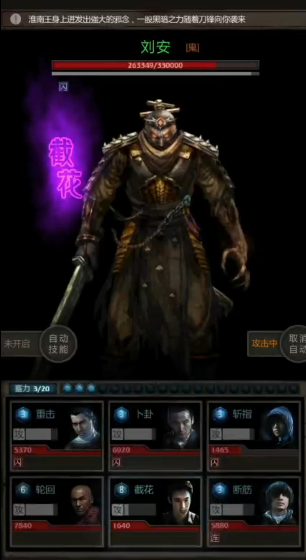 前四个小怪阶段需全程手动操作技能,第一个小怪的回血BUFF需精准控制治疗量避免溢出。第二、三个小怪以普攻为主,适时治疗即可。第四个小怪必须快速击杀,建议出场后立即用龙的高爆发技能压制。进入刘安阶段时需确保全员满血,蓄力点优先供给龙进行连续斩击。当刘安血量降至10%以下时,斩指技能的收益会低于普攻,应切换其他角色进行最终输出。战斗中需密切关注刘安的血量阈值和技能前摇,避免其释放致命技能。