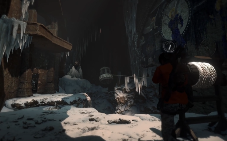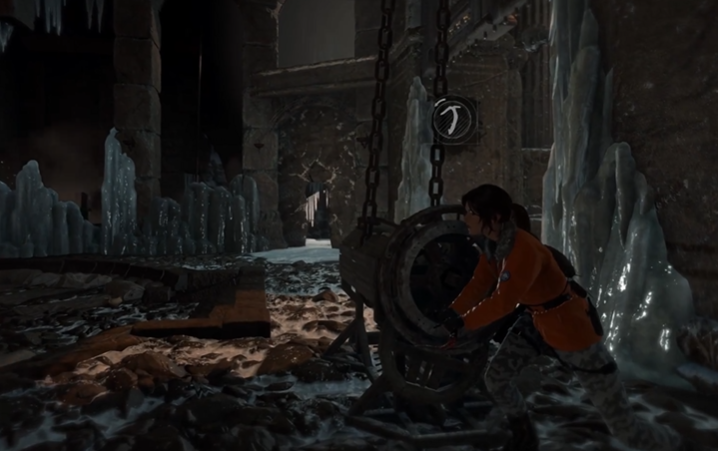 中央有个大钟摆装置,这是解谜的关键。先用弓箭绳把大钟绑在断崖上面的轮盘上,拉动轮盘将大钟抬高到最高点。这里要注意时机,当风吹进来时再切断绳子,让大钟摆动时能撞碎左侧的冰块。冰块后面藏着第二个转轴机关,转动它就能打开通往古墓深处的大门。