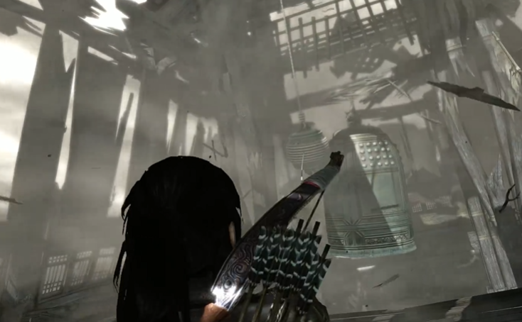 接下来是第二个风力解谜区域,中间挂着一个大钟,左右两边都有风吹进来。先打开一边的窗户,根据风向用弓箭拉动大钟,让它撞断左右两边的木柱子。两边都撞断后,把两个窗户全打开,再拉动大钟撞断中间的横梁,大钟就会掉下去砸穿地面,这样就能进入下一区域了。这里的关键是观察风向,别急着射箭,等风把钟吹到合适位置再动手。
