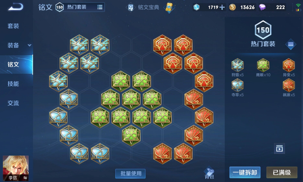 暗信形态的出装则有所不同,常见搭配包括追击刀锋、影忍之足、末世、暗影战斧、极寒风暴和魔女斗篷。这套出装注重攻速、生存和持续输出,追击刀锋提升清野效率,影忍之足增加物理防御,末世结合攻速和输出,极寒风暴和魔女斗篷则提供防御力,让暗信在带线或反野时更持久,名刀或复活甲可以在后期替换以应对不同局势。铭文搭配对李信同样重要,光信常用10异变、4狩猎加6隐匿和10鹰眼,这能显著提高物理攻击和穿透能力。如果选择暗信,铭文可以偏向10红月、10鹰眼和部分夺萃,以增强攻速、吸血和续航效果。