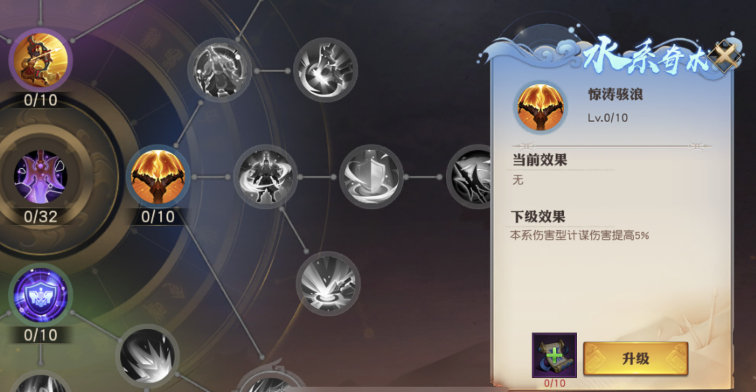 它这里面是有规矩的,每个星盘点亮的条件都不一样,不是你有计谋心得就能乱砸。比如有些高级的节点,它要求你的角色等级必须达到多少级,比如57级,同时还要求它前面连着的那几个低一级的技能,比如水法·二和水法·三这两个技能,都必须先升到十级,满足了所有这些前置条件,你才能去点亮或者升级它。所以点的时候要有计划,顺着星盘的线路一步步来,先把基础的那些节点给激活了,再往后去点高级的。