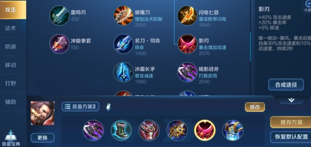出装顺序以红色打野刀起步,提供攻速加成和惩戒伤害,加快清野速度。随后选择抵抗之靴来减少控制效果的影响,增强生存能力。暗影战斧作为第三件装备,贡献物理攻击、冷却缩减和穿透属性,让技能伤害更加致命。宗师之力进一步强化普攻输出,配合技能使用能触发额外伤害。影刃是这套出装的关键,大幅提升攻速和暴击率,帮助曹操快速叠加被动。最后补上名刀来应对致命一击,确保在团战中能持续输出。这套装备组合注重攻击属性,牺牲部分防御来追求极致伤害。