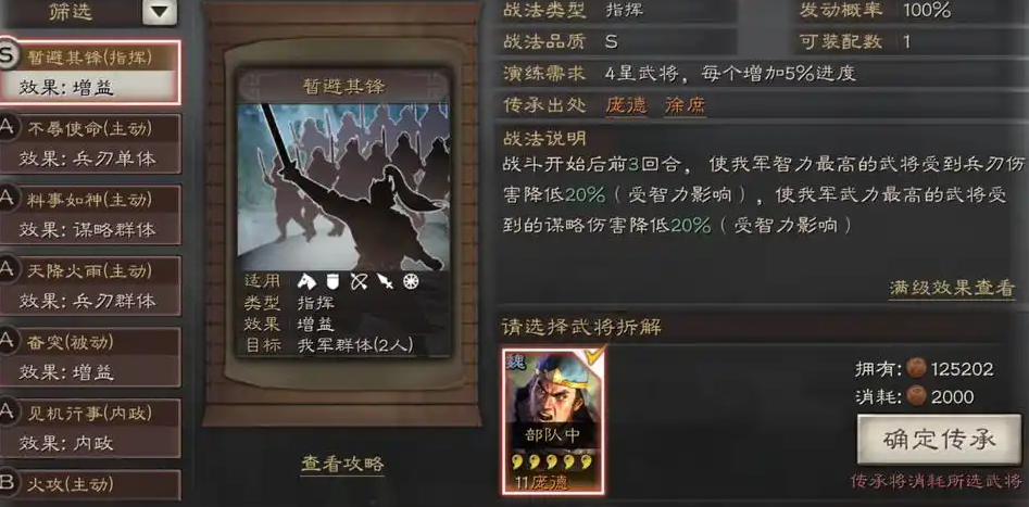 一个最常见的思路就是让他担任队伍的守护神,专门负责后勤和干扰。这就需要给他搭配一些能够增强团队生存能力的战法,比如陷阵营或者暂避其锋。陷阵营能提供稳定的急救效果和武力加成,让队伍更抗揍;而暂避其锋能在开局就为武力、智力最高的队友提供高额减伤,有效防止被对手爆发秒杀。这样一来,刘备本就强大的治疗能力,配上这些额外的减伤和回复手段,队伍的续航能力就非常恐怖了,能在持久战中慢慢把对手磨死。