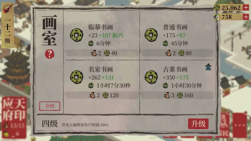 画室在苏州府和应天府都是高效的生产建筑满级后生产时间缩短,产出画卷的收益显著。配合通贵狸等雕像的祝福,画室的铜钱收入会进一步增加。类似的高效建筑还包括渔具店、丝绸店和药铺,它们在特定雕像范围内能发挥最大效益。优先升级这些建筑并分配高理财属性的居民负责,可以持续获得稳定的金钱流入。