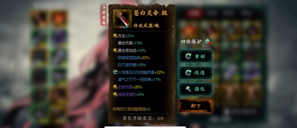 杀意六件套是技能流玩法的毕业选择,它能提供关键的杀意值加成与消耗收益,与炽刃的技能机制完美契合,若暂时无法凑齐,以铁裙子等散件过渡也是可行的,另一主流选择是无名宗师套装,它侧重于快速积攒奥义值打爆发,适合搭配充能护腕和医者传承戒指来使用,追求极限输出的后期玩法则会考虑双龙魔套等搭配,用以强化真实伤害效果。