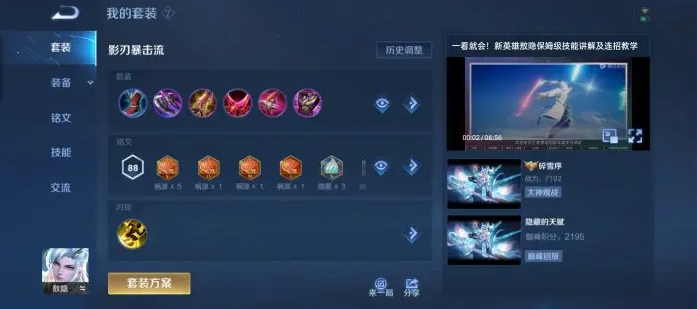 铭文搭配上,最主流的选择是10祸源、10鹰眼、10狩猎或10祸源、10鹰眼、7狩猎3夺萃。祸源提供前期急需的暴击率,鹰眼保证物理穿透,狩猎提升攻速和移速优化手感,而掺入夺萃则能增强前期的续航能力,减少对吸血装备的依赖。另有偏重生存的铭文搭配如宿命、虚空、调和,主要用于提升最大生命、冷却缩减和回复效果,进一步强化持续作战能力。