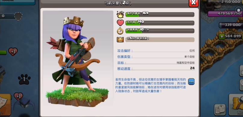 当大本营达到九本后,你便可以在家乡的建筑物列表中解锁并建造弓箭女皇的雕像。她是九本阶段解锁的强大英雄单位,拥有独立的生命值和攻击力,是后续进攻体系中的绝对核心。成功升级九本后,你需要在圣水收集器、金矿等建筑旁边的空地上找到弓箭女皇的基座并进行建造,这需要消耗一定数量的圣水。建造完成后,你的第一位英雄——1级的弓箭女皇就会登场,她将从这里开始伴随你的部落成长。需初始的弓箭女皇等级较低,其属性和技能效果都较为基础,需要通过后续持续的升级来发挥她的全部潜力。