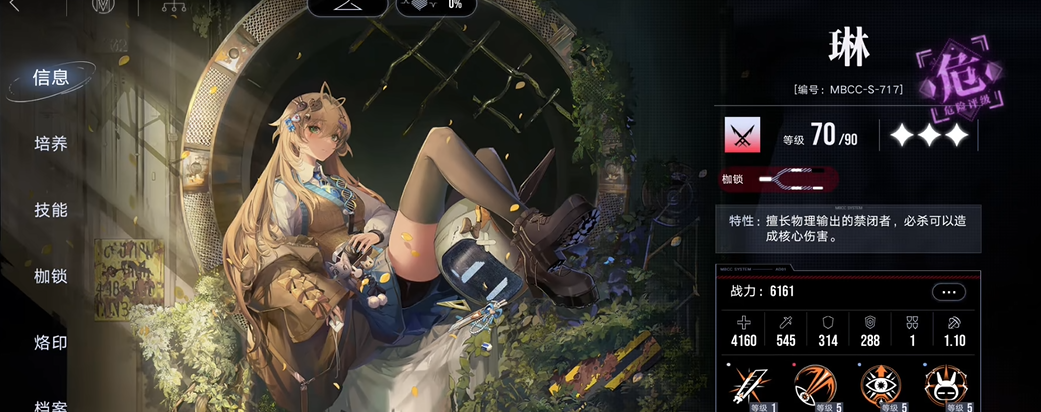 琳的技能设计围绕暴击伤害提升,她的被动技能贯穿魔眼可以在破核后为全体友方禁闭者提供显著的暴击伤害加成,持续一段时间。这种能力使得她在团队中扮演支援角色,能增强输出型队友的伤害效果。作为一名诡秘职业的禁闭者,她擅长控制和辅助,但她的破核制度和进攻范围受地形限制,需要玩家在部署时注意位置安排。尽管有这些局限,琳的整体表现仍然实用,能适应多种战斗场景。