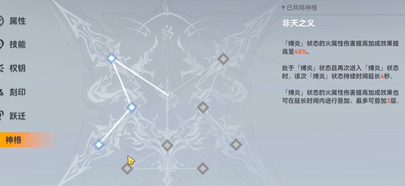 追求高伤害输出的玩家通常选择左线神格,该路线能显著深化缚炎状态的战略价值。左线神格不仅能提升缚炎状态下的火伤加成,更重要的是允许在缚炎状态下再次释放技能来延长状态的持续时间。这一机制使得通过连续施放技能来维持甚至叠加缚炎状态层数成为可能,当叠加到多层时,阿修罗能获得非常可观的爆发性伤害加成。围绕此神格的战斗节奏,是在确保技能冷却跟得上的前提下,于缚炎状态期间尽可能多地命中普通攻击来叠加专属钥从的增伤效果,并在状态结束前或叠加高层数时,释放强化的虚炎行空打出爆发伤害,从而构建起续状态、叠增伤、打爆发的核心循环。