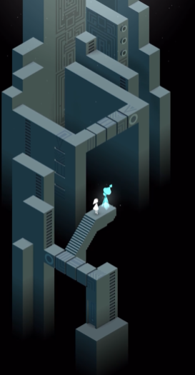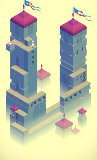第三章隐寺,玩家的核心操作是移动场景中特定的建筑模块来为公主艾达搭建通路。游戏开始时,公主位于建筑最外侧的底层,其头顶上方有一个按钮机关,目标是抵达那里。让艾达爬上身边的楼梯到达上一层,你会看到最外层有一块可以横向滑动的积木模块,将其向左拖动,让艾达走到这块积木上,然后再将积木向右拖动,就能将艾达送到右侧的小平台上,之后再次找到楼梯并爬上去,接近第一个小门。