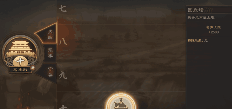 提升声望上限是拓展发展空间的核心环节,其关键在于解锁并升级特定的建筑。游戏初始的声望上限为15000点,这意味着你最多只能占领150块领地。突破这一限制的首要步骤,是将主城的君王殿建筑等级提升至10级。当君王殿达到10级后,你便能在内政界面中建造一个名为圆丘坛的特殊建筑,这是后续一切上限提升的基础。