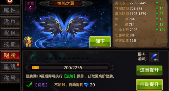 翅膀系统是提升战力的关键环节,平民玩家应将翅膀升至4阶或5阶,这能带来显著的属性飞跃。日常任务和活动中获取的绑钻是升级翅膀的重要资源,建议优先购买神鹰火种等材料用于翅膀进阶,避免将钻石消耗在其他不重要的地方。