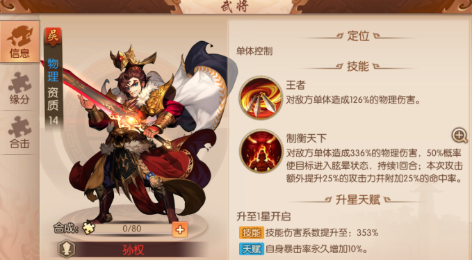 孙坚作为一名核心武将,其学习和成长路径主要围绕强化攻击爆发与生存能力展开,通过掌握特定的攻击技能、防御增益状态以及搭配专属神兵与阵容,来最大化其在战场上的输出与承伤作用。孙坚学习的核心攻击技能造成高额的列向或范围物理伤害,并附带强大的增益清除与自我强化效果。猛虎莲华能对一列敌人造成高百分比伤害并清除对方所有增益状态,同时提升己方武将的伤害加成与减免。他的霸王之怒技能则可令自身进入暴击状态,提升单点爆发的威力。在更高级的形态如钢胆孙坚或刚胆孙坚中,其技能炙焰、烈日炎威等能对目标及其相邻单位造成大量伤害,并附加破虏效果,此效果能根据自身防御力打出额外的高倍伤害,完美体现了其攻防一体的特性。