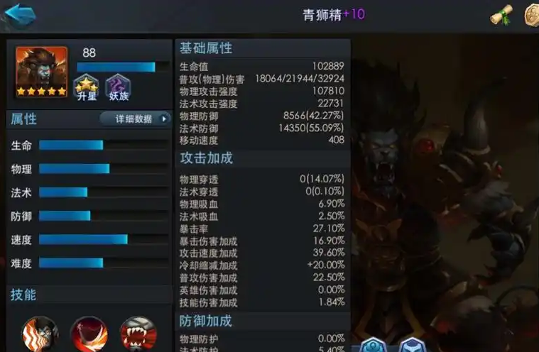 青狮精作为法师克星,拥有独特的战术价值。它的核心技能狮子吼能大幅削弱敌方法术输出,搭配一刀两断的突进控制和大口吞天的吸血反打,形成攻守兼备的节奏。这套组合的关键在于利用青狮精的破防和生存能力,配合队友打出压制效果。前期优先升级狮子吼提升清线消耗能力,中期补足大招的团战爆发,后期根据局势调整技能加点方向。