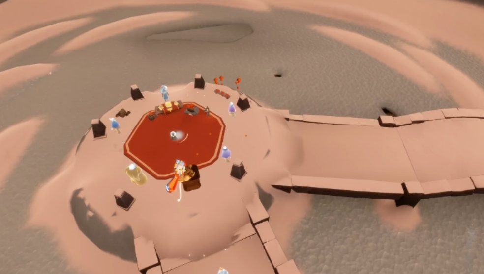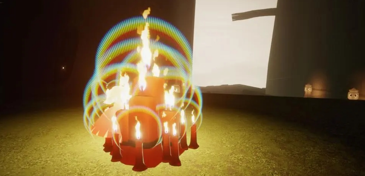 后期三角箭头蜡烛堆是重要推进节点,点燃后会产生强风将玩家推送至下一区域。此处需注意连续三个箭头蜡烛的触发顺序,每次强风推送后需立即调整姿态准备下一次跳跃。终点前的浮台群移动轨迹不规则,需观察其运动规律再行动。最终石像打坐会触发动画,角色随气流上升至光翼所在平台,触碰即可完成收集。