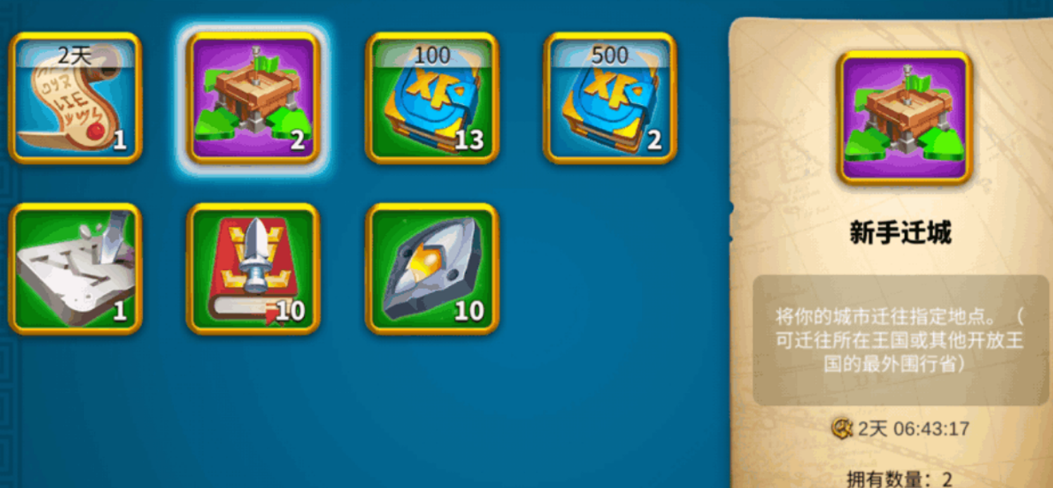 迁城道具分为新手迁城和领土迁城两种。新手迁城是建号时系统赠送的,用完就没了;领土迁城则可以通过联盟商店、宝石购买或任务奖励获得。如果主城等级超过12级,新手迁城道具会被回收,这时候只能靠领土迁城了。退出联盟后24小时内无法使用领土迁城,所以规划好时间很重要。