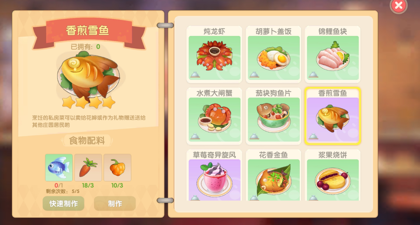制作流程上,首先确保背包中已集齐全部材料。进入餐厅厨房后,选择烹饪界面中的香煎鳕鱼选项,系统会自动识别材料是否齐全。若未完成前置支线任务,即使材料正确也无法成功烹饪。部分玩家反馈该食谱存在触发概率问题,建议在厨师等级达标后多尝试接取不同支线任务以提高解锁几率。