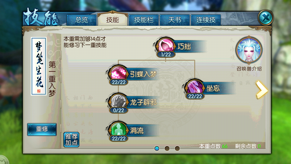 第一重推荐巧拙1点、引蝶入梦1点、坐忘和涓流点满,增强基础属性和生存能力。第二重花絮飞扬、竹引清风、幽光等被动技能尽量加满,提升输出和防御效果。第三重以退为进作为解控技能必点,画真入境和道心则强化召唤兽的持续作战能力。如果走输出路线,犬神谛听或孔雀明王这类大招必须点满;若偏向团队辅助,灵犀相通和血暖香繁的增益效果更实用。