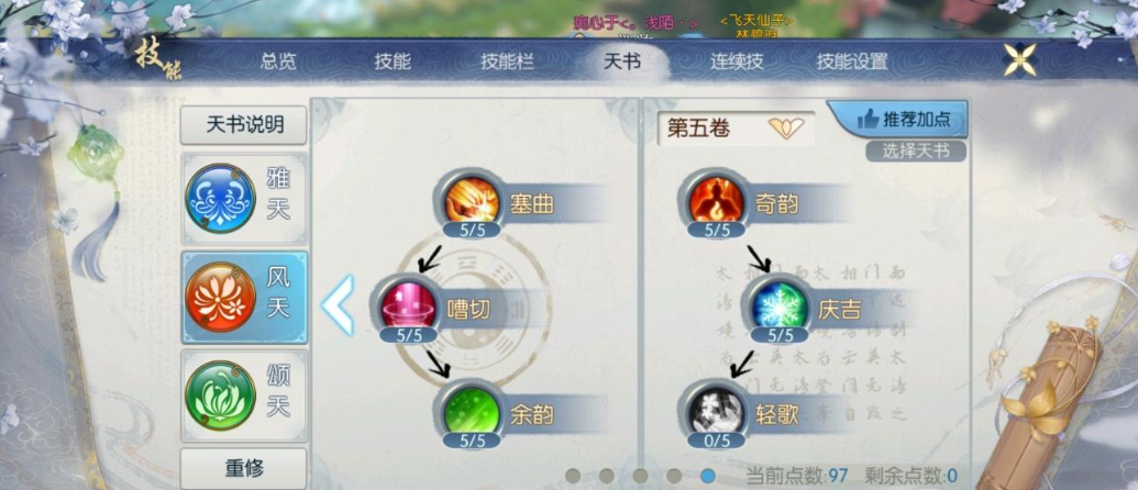 天书搭配偏向攻击和控场,选择提升魅惑概率和暴伤加成的路线。行云流水增加移速和攻击,适合追击或拉开距离,但冷却较长需谨慎使用。十面埋伏降低对手伤害和真气,干扰对方技能循环,适合持久战。九霄绝响的降抗和魅惑效果在单挑中表现突出,配合红鸾音刃能形成连续控制链。注意天华技能多为概率触发,实战中需要灵活调整走位,避免被对手反制。