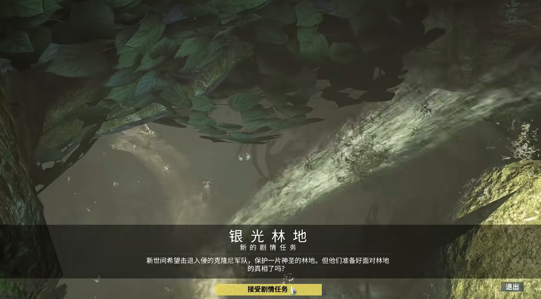 进入任意中继站后,前往中央广场并打开大地图,找到极西之翼区域。该区域分布着多个集团房间,其中新世间集团的房间具有丛林风格特征。与房间中央的NPC雅玛琳对话并选择银光林地选项,她会说明克隆尼正在其圣地建造工厂的情况,请求玩家协助阻止这一行为。接受任务后返回飞船激活任务即可开始后续流程。