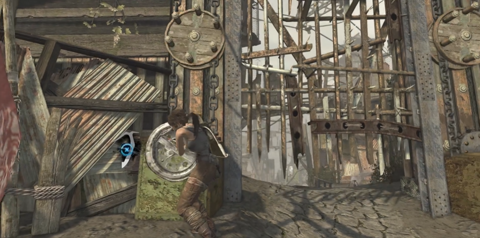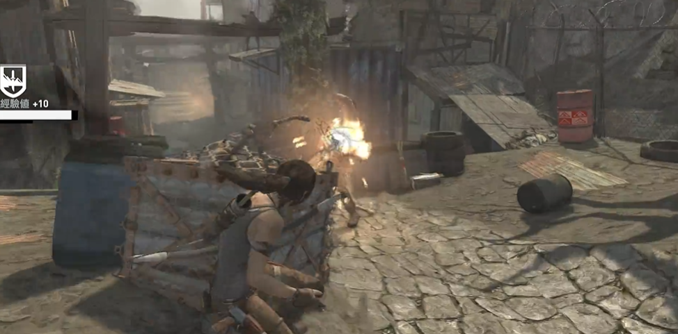 贫民窟是一个重要的战斗场景,玩家需要面对大量敌人并克服虚弱状态的限制。刚进入贫民窟时劳拉处于虚弱状态,任何动作都会消耗体力,需要格外小心。首先沿着水道前进,在通道口用弓箭暗杀楼上的敌人,注意地面上的白布陷阱,踩中会被吊起。解决敌人后继续前进,在掩体后回复体力,转角处会遇到冲锋枪敌人,击杀后用绳索拉下飞机甲板进入机舱搜索医疗用品。