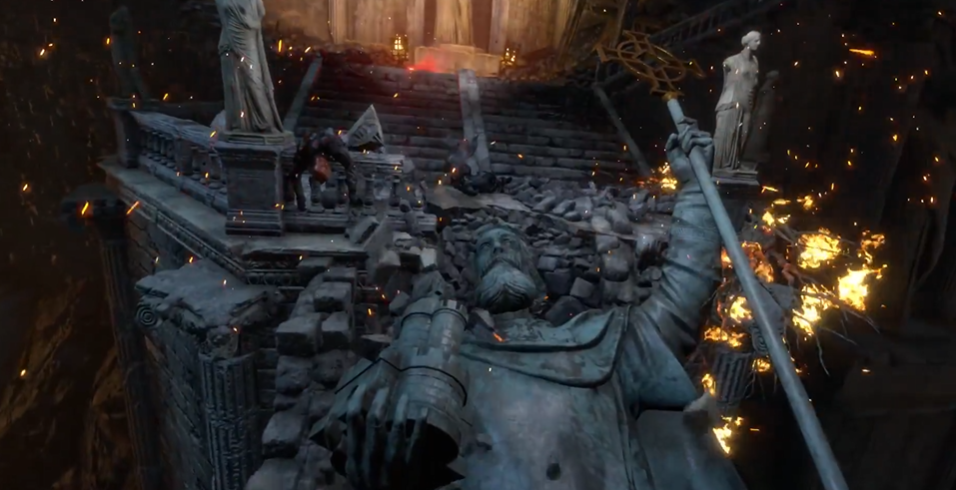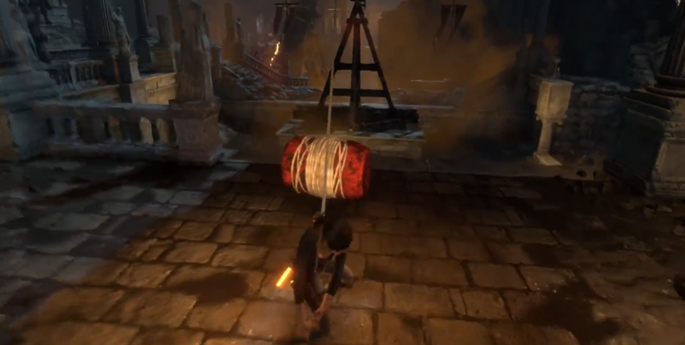 炸雕像的关键在于利用场景中的希腊火桶和机关联动。首先咱们要找到雕像两侧的油桶,用弓箭把起重器的一端拉到希腊火附近,把绳子绑在木桶上,另一端固定在起重器。由于单边重量不够,需要在起重器另一侧再加个木桶保持平衡,这样就能把希腊火运到水流处。