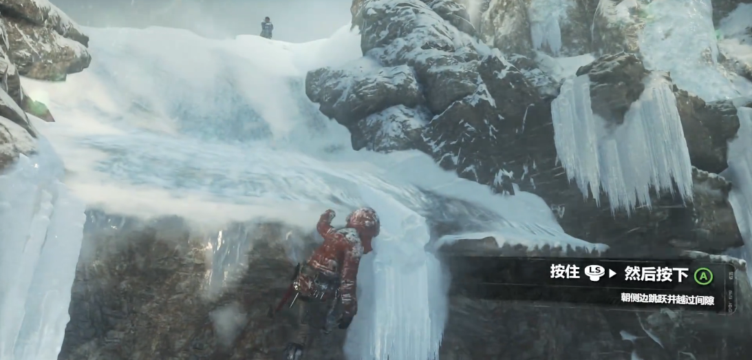 抵达山顶后还没站稳,突然遭遇雪崩。这时要立刻向前狂奔,路上的木板会不断坍塌,必须用跳跃避开。注意这段路右侧是陷阱,稍微偏右就会陷进雪里掉下去。一路冲到滑索附近果断跳上去,下滑过程中要快速用冰镐钩住崖壁稳住身体。之后继续在坍塌的冰面上跳跃前进,直到触发剧情进入下一个场景。