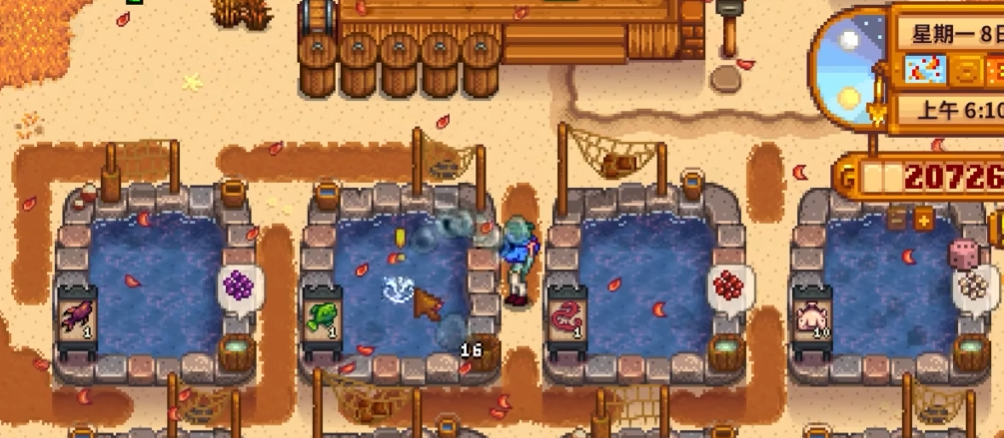 鱼塘日常管理需要注意,鱼类会定期产出鱼籽或其他物品,产出概率和种类由鱼种及数量决定。使用金色动物饼干可使产量翻倍。虽然可以从鱼塘中钓鱼,但钓起的鱼均为普通品质,不计入收集也不获得经验。特殊鱼类如传说鱼类、史莱姆鱼等会使鱼塘水变色,具有装饰效果。在鱼塘放置木牌或石牌可显示当前鱼类和数量,便于管理。