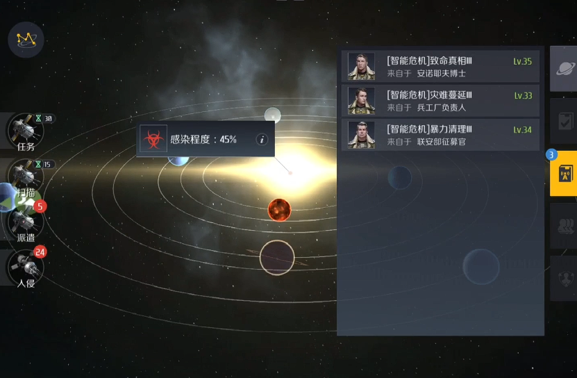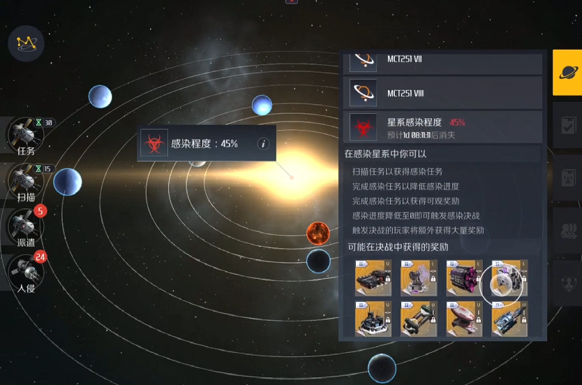 感染任务的接取方式与普通星系任务类似,但难度和奖励更高。玩家需打开星系星图并点击刷新感染任务按钮,每次刷新可获取3个任务,任务探针每12小时恢复1根,最多积累4根。建议优先选择感染程度较高的星系,这类区域任务密度更大且决战触发更快。任务类型包括筛查人员、控制主脑及回收舰船等,均要求使用特定舰船完成战斗目标。