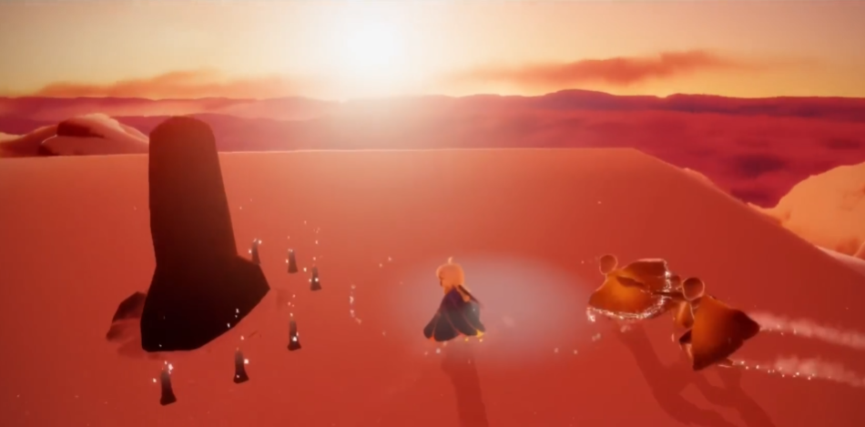 滑完赛道会到环形竞技场,这里需要和小伙伴一起点亮大门才能进去。如果是一个人玩,可以等别的玩家过来帮忙。竞技场里面没啥难度,主要是用来休息和社交的,长椅可以坐下来聊天。这一关的难点其实是飞行和滑行操作,有些光之翼藏得比较刁钻,比如赛道中间或者斜坡顶上,多试几次总能拿到。