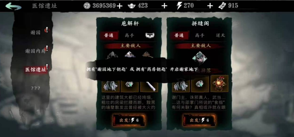 药园钥匙的获取需要完成支线任务灭法师的残酷美学,该任务在红叶寺主殿内接取。任务要求玩家前往顶洗冤雪、医馆遗址庖解轩、坠星原蚀日莽原三个关卡的逆天难度副本收集特定物品。完成收集后,需前往陨石巨坑背后的高手难度区域,与灭法司NPC对话即可获得钥匙。钥匙用于开启药园最后一关的通道,是推进剧情的关键道具。
