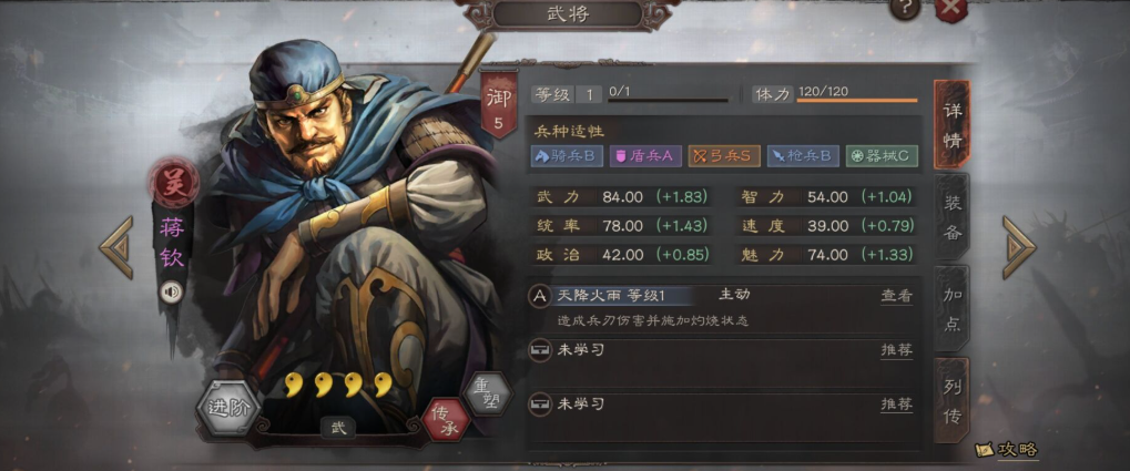 搭配四星武将时,首先要关注的就是他们的兵种适性。一个武将的兵种适性决定了他在某个兵种下的属性加成,S级最高,A级次之。咱们要优先选择那些适性高的武将,并且尽量凑成同一兵种的队伍,这样才能最大化队伍的战斗力。比如说,你想玩弓兵队,那就优先找弓兵适性是S或者A的武将,像吴国的韩当、蒋钦、徐盛就是经典的组合,他们有吴越猛士的缘分,全体还能提高12点统率,前期开荒成型快效果也好。枪兵、盾兵、骑兵也是同样的道理,先确定你想玩什么兵种,再围绕这个兵种去挑武将,这是搭配的基础。