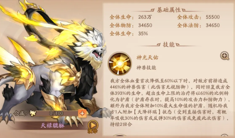 对于追求顶级战力的玩家,紫金品质的神兽是后期重点。天禄貔貅是目前魏国顶级的紫金神兽之一,它不仅能在队友血量低于阈值时提供巨额治疗和护盾,还能同时对敌方前排造成无视防御的伤害,攻防恢复一体,功能性极为全面。另一只紫金神兽离火天官则偏向进攻与控制,它的技能在战斗开局即可触发,对敌方全体造成高额伤害并附加不可清除的灼烧效果,同时能降低敌方怒气,其护佑技能为前排附加的火盾还具备反伤能力,能有效打乱对手节奏并补充群体输出。