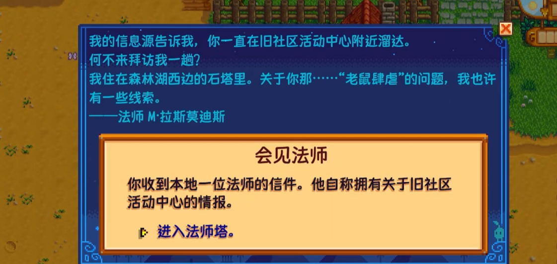 进入法师塔,首先得触发社区中心的剧情。在春季非雨天的上午8点到下午1点之间,从巴士站进入鹈鹕镇,有机会看到废弃社区中心的剧情。和镇长刘易斯对话后,就能进入废弃社区中心探索了。进去后直奔左下角的房间,地上有个金色卷轴,点开后是一堆乱码,别担心,这是正常流程。第二天你会收到法师的来信,正式邀请你去法师塔做客。