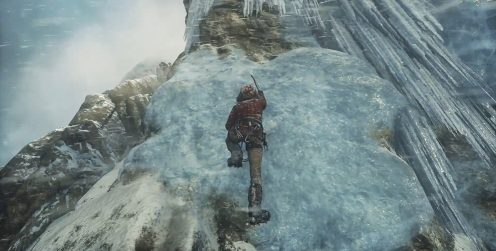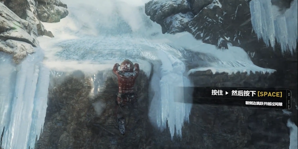 从滑索上落下后,劳拉会处于悬崖边缘,此时必须迅速按下互动键使用攀岩斧钩住岩石以稳住身体。接下来的道路会持续坍塌,玩家需要保持向前跳跃的节奏,利用冰壁进行攀爬。在冰壁上攀岩时,整个结构会发生坍塌,形成新的路径,此时操作具有时间限制,要求在短时间内完成连续的攀爬与跳跃动作,一次不成功可以多次尝试。